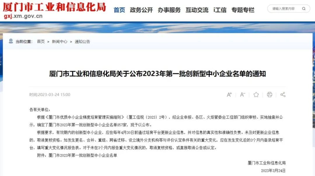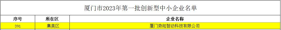 3月24日,厦门市工业和信息化局公布本年度第一批创新型中小企业名单,我公司成功入选 。