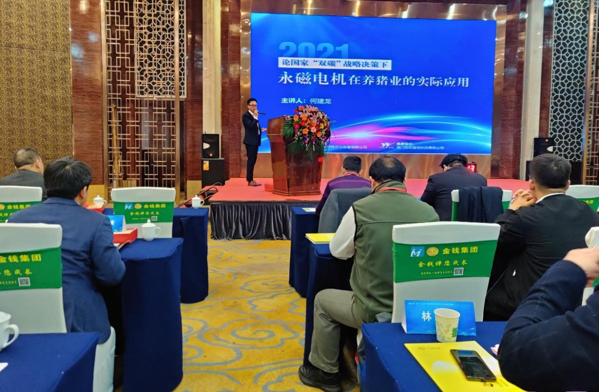 2021年12月29日至30日 ,“『猪场之旅』2021行 :生猪产业高质量发展巡回报告会”收官盛典在福建省三明市沙县区君华大酒店隆重举行。厦门尊时凯龙人生就博智动科技有限公司总经理李宓贞和市场部总监何建龙等一行人出席此次报告会 。会上,何建龙总监为与会听众带来了一场名为“国家‘双碳’战略决策下永磁电机在养猪业的实际应用”的精彩报告 ,详细介绍了永磁电机如何助力畜牧业碳减排,为国家实现双碳目标做贡献 。
